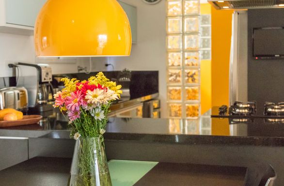 Os acabamentos incluem piso de tacos de madeira maciça (Cumaru) na área social e íntima, teto rebaixado, porcelanato e pastilhas nos banheiros, e marcenaria planejada de alto padrão. A cozinha, moderna e funcional, foi equipada com eletrodomésticos de última geração. A área de serviço é reservada e conta com aquecimento a gás.