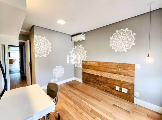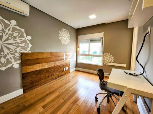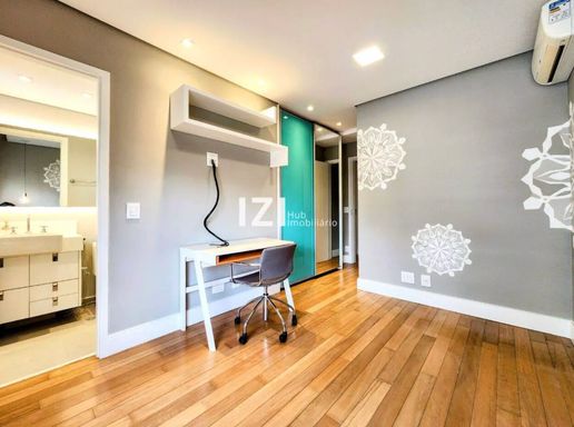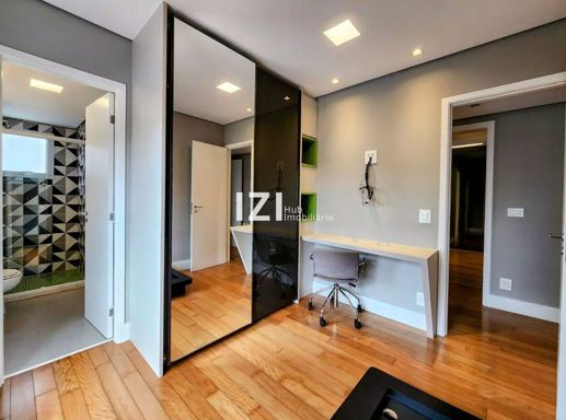 As 4 suítes contam com piso de madeira, closets planejados e excelente marcenaria; destaque para a suíte master com banheira de hidromassagem. A cozinha americana integra-se ao gourmet, há espaço dedicado para home-office, ar-condicionado em diversos ambientes, blindex nos banheiros e ducha a gás para maior conforto.