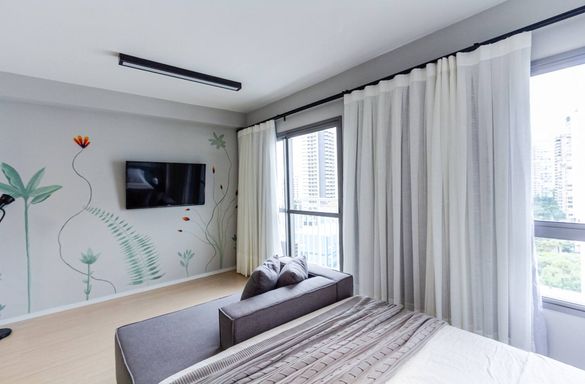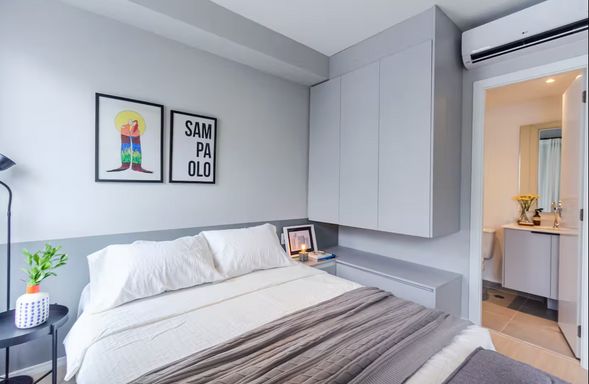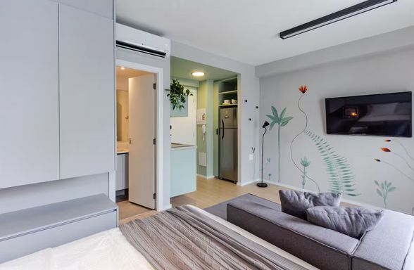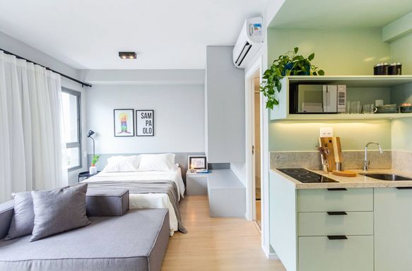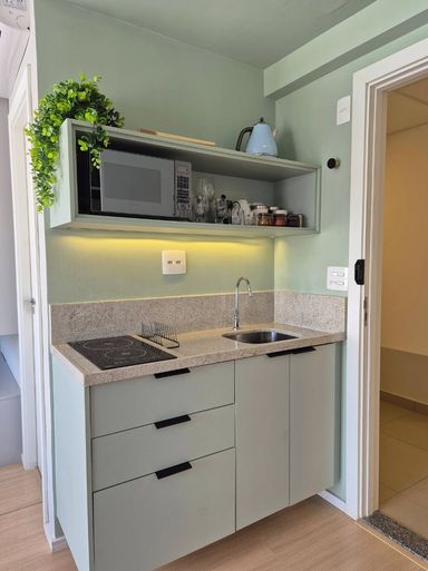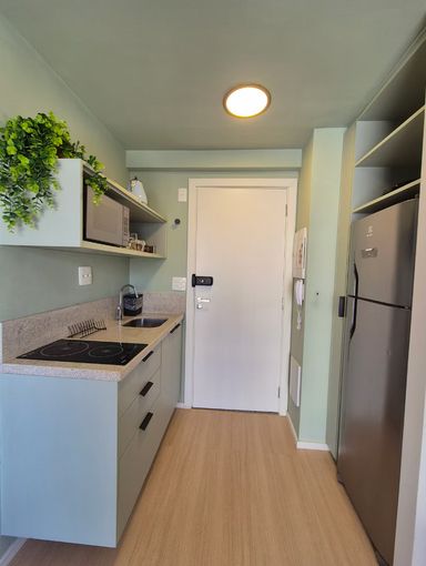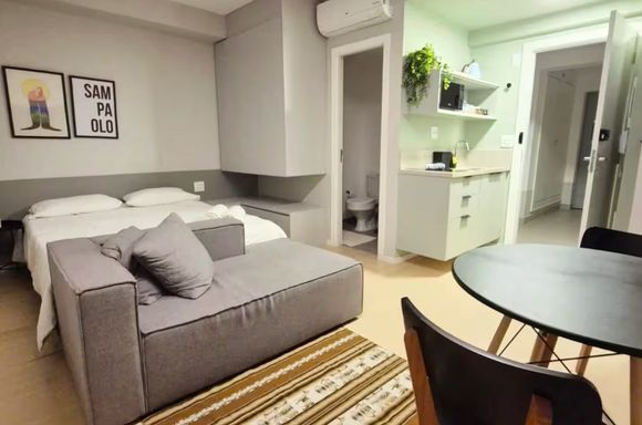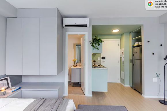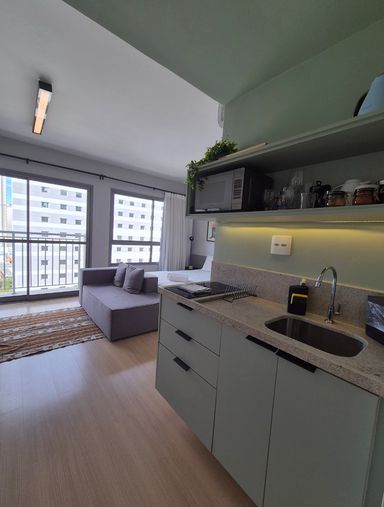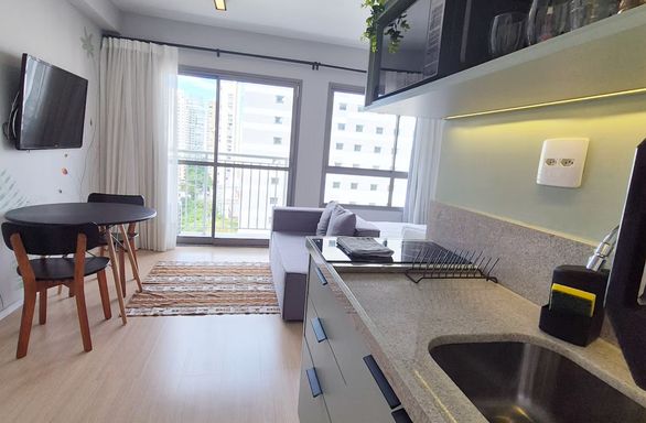 Apartamento mobiliado e decorado, 27m2, sem vaga, com ar condicionado, completo para locação.