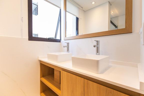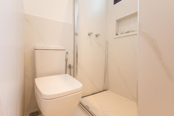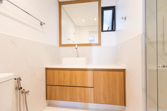 2 banheiros reformados, com acabamentos contemporâneos